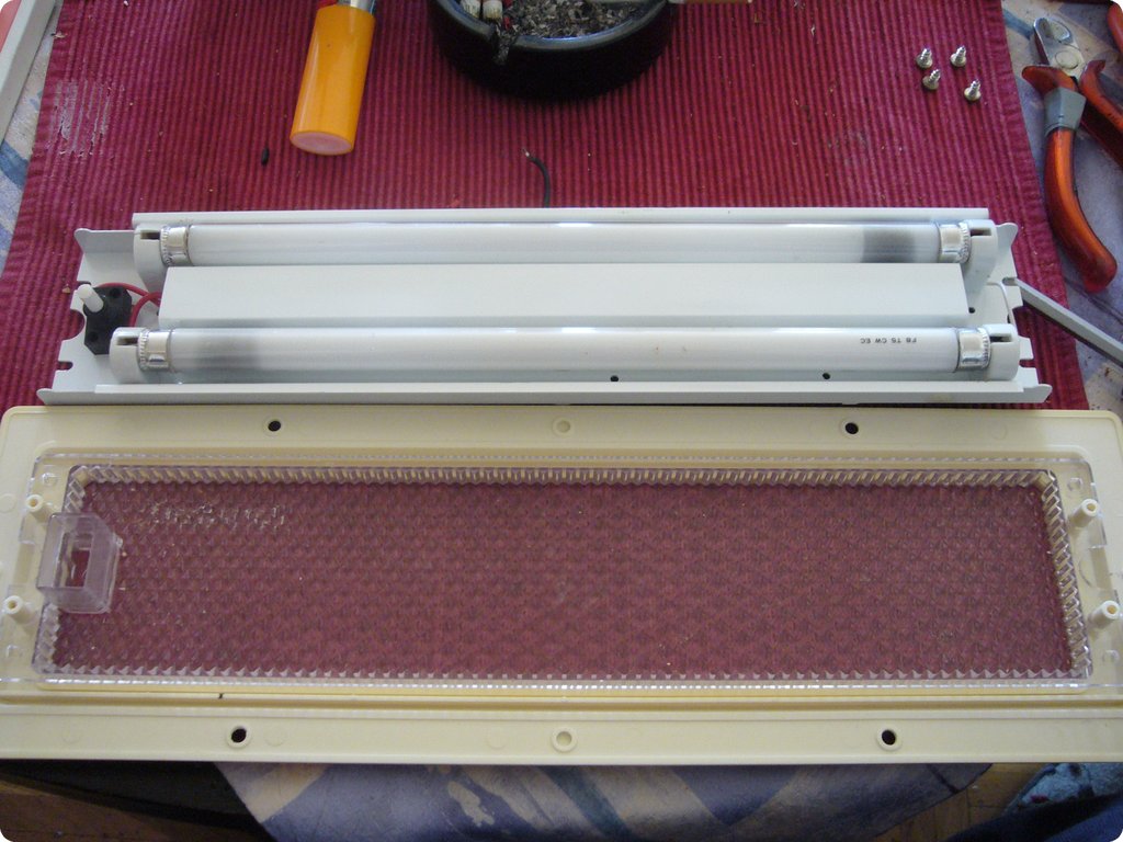 Eine der ersten Massnahmen zum Stromsparen im Gipsy war das Umrüsten der Innenraumbeleuchtung. 2010 waren die Möglichkeiten noch nicht so vielfältig wie heute (2019). Wir haben aus einzelnen weißen LED-Birnchen und Kabelkanälen Lichtleisten gebaut, die alte Elektronik aus den Lampen entfernt und das Ganze wieder in den Korpus gesetzt.